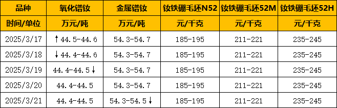 钕铁硼:作为稀土永磁材料的典型代表,其市场表现与稀土原料市场紧密相连。本周钕铁硼市场需求整体表现较为平淡。受上游镨钕等稀土原料价格波动以及市场观望情绪影响,钕铁硼生产企业订单量未有明显增长。由于原料价格的不确定性,部分下游应用企业在采购钕铁硼产品时较为谨慎,采取按需采购策略,导致钕铁硼市场交易活跃度不高。在价格方面,由于原料成本的支撑,钕铁硼产品价格虽未出现大幅波动,但随着原料价格的弱势震荡,部分小型钕铁硼生产企业为获取订单,价格上有一定程度的松动,但整体价格区间相对稳定。目前,普通规格的钕铁硼毛坯产品价格在一定范围内波动,市场竞争较为激烈,企业利润空间受到一定程度的挤压。