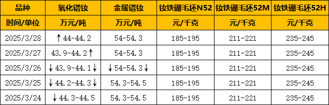 钕铁硼:钕铁硼作为稀土下游的重要应用领域,其市场表现与稀土原材料价格紧密相关。本周,受稀土主流产品镨钕镝铽价格下跌影响,钕铁硼生产成本有所下降。然而,由于市场对未来稀土价格走势存在不确定性,下游客户采购态度谨慎,导致钕铁硼市场需求并未因成本下降而出现明显增长。部分钕铁硼生产企业为了维持市场份额,不得不降低产品价格,以吸引客户。目前,钕铁硼市场竞争激烈,价格整体呈下行趋势,不同规格和性能的产品价格差异较大,市场仍在等待新的需求增长点来改善现状。