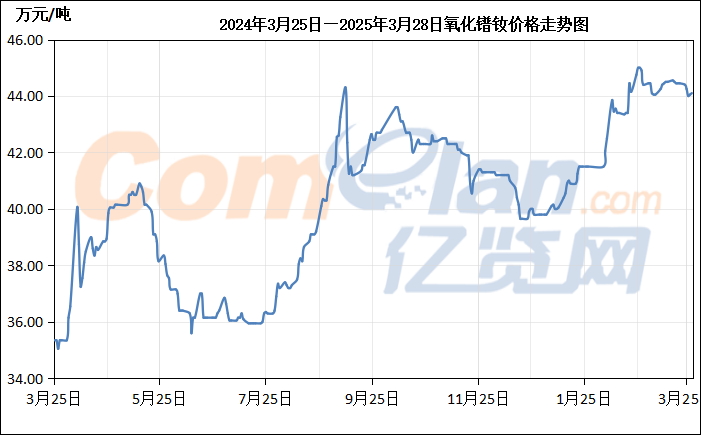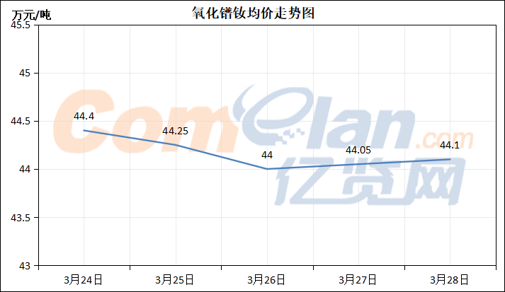 镨钕:本周镨钕价格先抑后扬。周初,受缅甸矿消息影响,市场情绪转弱,商家纷纷低价出货,主流报价持续走低,且低位成交多由贸易商主导。随着氧化物价格下调至43.9-44.1万元/吨,市场逐渐触底。临近周末,市场行情开始回暖,期货价格率先上涨,带动现货报价跟涨,低价现货收紧,整体报价小幅上调。