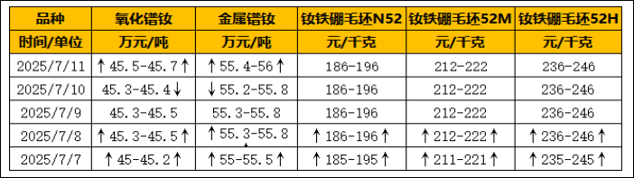 本周稀土市场价格整体呈现偏强走势。周初,镨钕价格保持稳定,进入周中后持续上行。金属生产厂家陆续出货,对氧化物的采购量有所增加,导致市场上低价现货供应收紧。同时,期货盘面价格处于高位,带动现货市场价格同步上涨。到了周后期,镨钕价格趋于平稳,金属厂根据实际需求进行询单,市场报价保持坚挺。磁材企业对金属的采购情况较好,陆续完成接货,使得金属成交价格有所上移,低价现货进一步减少。
