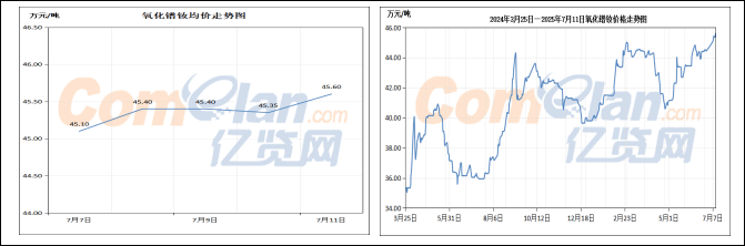 铽的价格本周出现上调。周初,氧化铽价格保持稳定,下游的询单情况较为一般,市场上有少量低价报出,但厂家报价坚挺,并不愿意以低价出货,市场整体情绪平稳,贸易商则以少量询单来补充库存,目前氧化铽的报价在716- 720万元/吨。金属铽价格随氧化铽同步调整,由于磁材订单情况一般,下游采购量不大,多为少量采购,金属厂报价有所上移,成交以满足刚需为主,当前金属铽报价在885-889万元/吨。
