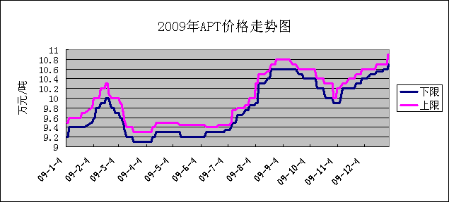 APT市场紧跟钨精矿市场的变化,一月份APT价格稳定在9.4-9.6万元/吨,进入二月份,供应商开始提高报价,二月中旬,APT价格上涨至9.8-10.0万元/吨,一周后价格下滑,三月中下旬,APT价格下滑至9.1-9.3万元/吨,四月下旬,APT价格小幅上涨至9.3-9.5万元/吨,之后维持此价位,六月末APT报价再次上涨至9.4-9.5万元/吨,此后价格持续上涨直至九月中旬的10.6-10.8万元/吨。九月中旬开始,APT价格再一次回落,至十一月初,价格破十之后反弹,此后APT价格一路上涨直到年底的10.7-10.9万元/吨,2010年春节前持续上涨趋势,有订单签至11.1万元/吨。APT出口市场一直低迷,为了鼓励出口,国家在2009年将APT的出口关税从之前的10%下调至5%,这在一定程度上增加了出口商的积极性,但另一方面,国外市场的需求并没有好转,出口市场依然不容乐观。APT出口价格随国内市场价格波动而调整,价格在185-220美元/公斤之间浮动。2009年APT出口量锐减,1-11月份累计出口2803吨,较去年同期的4717吨同比减少40.57%。