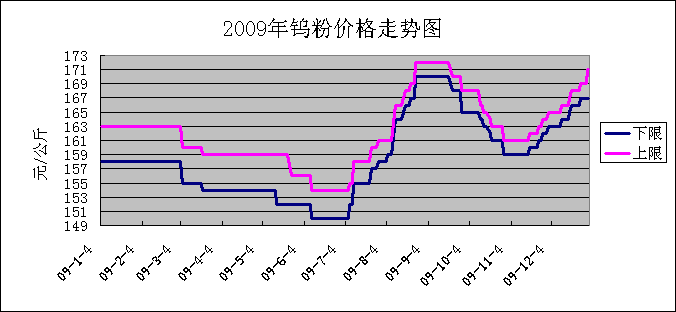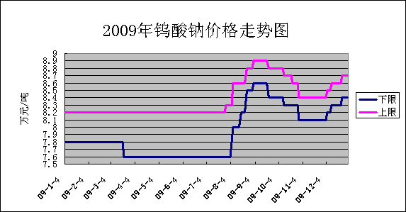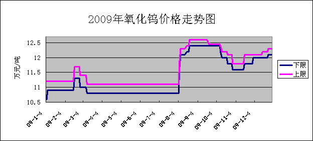 2009年一季度,市场价格低位运行,春节过后,钨精矿价格基本维持在6.3-6.4万元/吨,进入二季度,钨系市场需求逐步下滑,钨精矿价格开始回落,价格维持在6.0-6.2万元/吨,7月份钨矿主产区赣州地区遭受洪水灾害,钨矿山企业大部分停产,再加之国家对钨矿山的整顿,使一些不符合国家要求的矿山停产,导致钨砂供应紧张,钨矿价格略有上涨。八月份钨市持续七月份的上涨势头,在八月末九月初,价格攀升至7-7.2万元/吨,此价格持续至10月中旬,之后市场开始回落。直到12月中旬市场价格在人为因素的推动下开始回升,直至2010年春节前,价格一直在走高。此期间,市场成交量不多,需求没有好转。钨精矿的总量依然较大的,但是由于矿商惜售,所以市场上流通的钨精矿较少。
