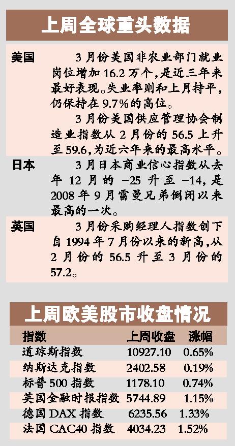 上周,主要经济体纷纷公布3月份重头经济数据,其中,美国非农就业数据和制造业数据均造好,极大鼓舞了全球投资者信心,美股创下18个月来新高。纽约的瑞信经济学家杰伊·费尔德曼说,美国制造业正在全面复苏,这是全球经济强劲增长的信号。
