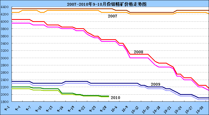 上图为2007-2010年9月初至10月底的国内钼精矿主流报价走势图,以下本网就具有代表性的2008年和2009年钼市行情做简要分析: