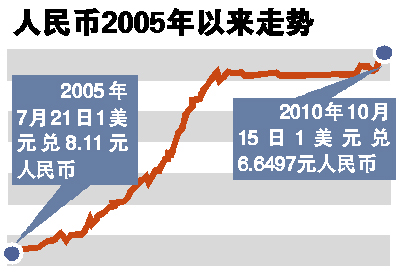 10月15日,美元对人民币中间价为6.6497元。至此,从6月19日人民银行宣布进一步深化人民币汇率改革以来,人民币对美元已升值2.6%。而美联储主席伯南克日前表示,由于通胀太低和失业率居高不下,可能有必要采取进一步的货币刺激措施。这也意味着美元维持弱势和非美元货币升值暂时不会结束,因此,人民币未来走势还难以预料。