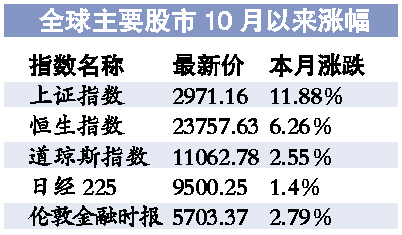 最近全球主要经济体的经济数据并没有显著改善,但多国货币竞相贬值,成为股市上涨最为直接的推手。道琼斯指数一度突破11100点。香港恒生指数9月以来上涨已达15%左右。A股方面,上周上证指数以8.49%的幅度领涨全球。
