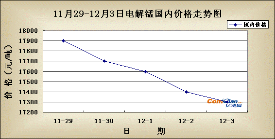 电解锰周评:本周电解锰价格价格继续呈继续下跌的态势,价格接着上周持续下滑,下跌幅度达600元/吨。成交量在周末稍有起色。截止周末为止,主流价格为湖南花垣17300-17400元/吨,湖南怀化17300-17400元/吨,重庆秀山17300-17400元/吨,贵州松桃17300-17400元/吨,广西17500-17600元/吨,上海17600-17700元/吨。