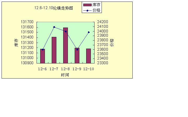 本周伦镍先扬后抑。欧债危机缓解,美国失业率创新高,量化宽松货币政策规模有望扩大,这一消息一度使伦敦基金属大幅上扬,镍突破了24000美元/吨,而本周是中国重要经济数据公布的时间,对中国需求将减少以及紧缩货币政策将加码的忧虑打击市场人气,伦镍最低回落至23435美元/吨。库存本周一直维持在13.1万吨之上。