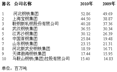 国际知名财经媒体彭博社今日特别转发了有关中国钢铁产量的消息,消息说,中国钢铁协会(the China Iron and Steel Association)所引述的一则由联合商务网 (UC361.COM)整理的研究报告列举出了一份关于2010年中国十大钢厂的排名。 联合商务网的报告指出,2010年中国十大钢铁制造商合计生产约3.047亿吨粗钢,占全国粗钢总产值49%。2009年中国十大钢铁制造商合计产值占全国粗钢总产值为45%。