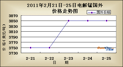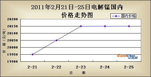 国内方面:在上周持续上涨之后,本周电解锰市场继续上周势头,不断攀升,且出现3年内价格新高,一直到周末价格才走向平稳。周末为止,市场主流价格为湖南花垣20100-20200元/吨,湖南怀化20100-20200元/吨,重庆秀山20100-20200元/吨,贵州松桃20100-20200元/吨,广西20200-20300元/吨,上海20500-20600元/吨,较上周涨幅达600元/吨。