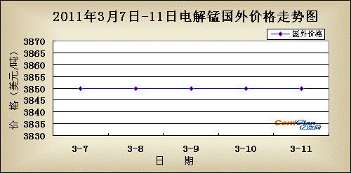 国际价格:跟随着国内走势,电解锰国外市场也没有太大起色,需求平平。亚洲市场FOB价格为3800-3900美元/吨。
