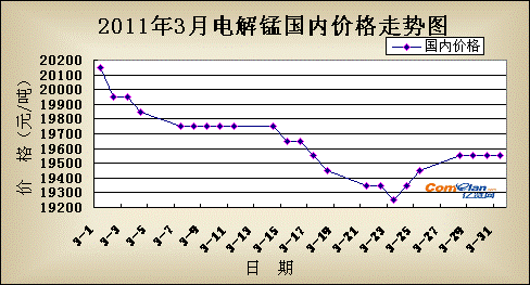 在2月份电解锰价格上涨之后本月电解锰价格趋于理性,由于年后不锈钢厂的采购逐渐放开,电解锰价格快速飙升,而进入3月份后面对过高的电解锰价格中下游采购商开始望而却步,观望为主,成交量较上个月有了明显减少。而电解锰生产厂家在上月时候几乎把年后库存纷纷出售殆尽,到3月份后仅维持原有订单生产。直到月末电解锰价格接近成本价,开始触底小幅回升。