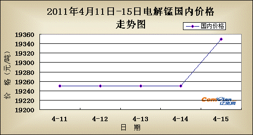 国内市场:在上周企稳回调以后,本周电解锰市场整体以稳为主,直到周末才有微弱波动。到目前为止市场主流价格为湖南花垣19300-19400,湖南怀化19300-19400,重庆秀山19300-19400,贵州松桃19300-19400,广西19400-19500,上海19800-19900(元/吨)。