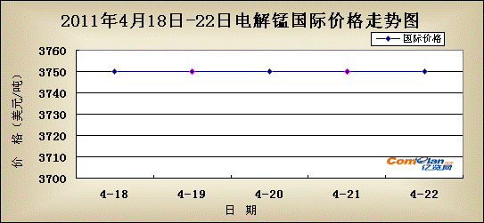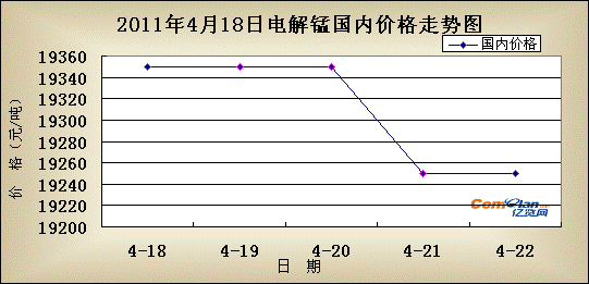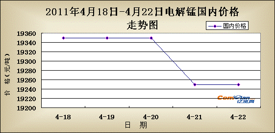 国内市场:由走势图来看本周电解锰市场并没有保持上一周上调势头,而转头下调。截止周末市场主流价格为湖南花垣19200-19300,湖南怀化19200-19300,重庆秀山19200-19300,贵州松桃19200-19300,广西19300-19400,上海19600-19700(元/吨)。