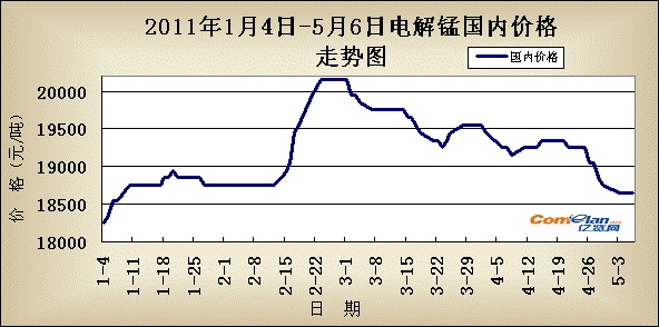 国内市场:在上周电解锰价格持续下跌后,本周价格走稳。截止周末市场主流价格为湖南花垣18600-18700,湖南怀化18600-18700,重庆秀山18600-18700,贵州松桃18600-18700,广西18700-18800,上海19000-19100(元/吨)。
