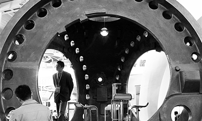 观众在南京举行的中国铸造零部件展览会上参观风电轮毂。(新华社发)
