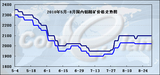 去年5月初国内钼精矿主流价格2300-2350元/吨度,随后市场开始走弱,至6月中旬价格总体下滑350元/吨度。当时国内钼市受欧债危机影响严重,房地产政策增加了钢铁工业的压力,加上实际需求增长不明显,导致后市看空心态浓重,促使价格急速下滑。 6月中下旬国内钼精矿迎来了一波小幅回弹,但只是市场的合理反弹,7月初再度进入下滑通道。其时矿山惜售报价坚挺,采购方看空后市,导致市场成交僵持,至7月中旬有企稳迹象,价格达到1900-1950元/吨度探底。随后钢材市场强势反弹,股市上涨,LME基本金属全线收高,对市场起到了提振作用,价格开始逐渐回升。 7月中旬至8月底,栾川地区受洪水影响出货困难,市场上钼精矿供应量减少,贸易商借机炒作,将价格抬高至8月初的2030-2100元/吨度。随后由于缺少利好因素支撑,市场持稳至8月底。 二、2011年5月份及后市钼市场现状分析 1、矿山出货企业渐多 本周开始,国内多数矿山企业开始纷纷表示向外出售钼精矿,但市场实际成交量不大,多数采购商不敢轻易进场采购钼精矿,导致市场成交量不大。据吉林地区一矿山企业称,本周共计向外出售钼精矿100吨,价格2120-2130元/吨度,近期感觉市场采购的企业渐渐减少;另据该地区另一矿山企业称,本周打算向外出售钼精矿100吨左右,品位在50%以上,现向外报价2140元/吨度,通过近几日的报价来看,采购的企业不多;另据河北地区一矿山企业称,昨日向外出售钼精矿40吨,成交价格2135元/吨度(部分承兑),本周还打算向外出售钼精矿100吨左右,现款价格2130元/吨度,价格招标前期有小幅下行,但成交量一直处于低位;另据栾川地区一矿山企业称,本周打算向外出售钼精矿200吨,向外报价2120元/吨度,但感觉这个价位成交有一定的难度,该地区其它矿山企业也都打算出货,但采购方的确很弱。有以上国内各矿山企业情况可以看出,矿山出货的企业逐渐多了起来,主要是前期矿山企业没怎么出货,感觉挺一挺能把这波行情挺过去,可没有想到,国际钼市还一直处于下行阶段,没有给国内钼市形成一定的支撑,最终导致资金压力有些紧张,从而决定出货,短期内来看,国内钼精矿价格小幅下行的几率较大。 2、钢厂进场招标但价格仍不乐观 自17日(上周二)国内钢厂开始新一轮招标至今,招标量已超过2300吨,但价格仍徘徊在14.5-14.6万元/基吨(承兑)的低位,给钼铁市场带来了较大的压力。据本网了解,昨日华中地区一钢厂招标钼铁120吨,价格14.5万元/基吨(承兑);华北地区一钢厂招标钼铁200吨,价格暂未揭晓,预计价位不会过高。多数钼铁厂表示,由于钢厂招标价过低,对后市没有信心,目前有停产观望的计划。 3、南方钢厂6月份限电 今年国内遭遇了历年来最大的电荒,国内多数钢厂将被限电减产,其中华东和华中几家大型钢厂受影响较大。据本网统计,该地区几家大型钢厂招标量比去年同期都有所减少,预计未来几个月仍不会明显增加,而钢厂招标量减少将直接导致钼铁需求量的减少,给低迷的钼铁市场再添一笔不利因素。本网预计,未来一段时间国内钼铁价格都难以回升。 三、欧洲钼市持续低迷 目前欧洲钼市表现平淡,氧化钼价格16.5-16.6美元/磅钼左右,成交量非常少,钼铁最低价已出现38.5美元/千克钼(含税)。据国内一贸易商表示,欧洲钼市钼铁现货库存约2000吨左右,而钢厂对散货的采购量仅几十吨,加上夏休将至,贸易商也没有囤货打算。本网预计,短期内欧洲钼市仍将继续下滑,国内钼市也将受到一定的影响。