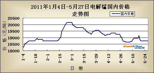 国内市场:本周电解锰价格平稳,价格稳定为:湖南花垣18700-18800,湖南怀化18700-18800,重庆秀山18700-18800,贵州松桃18700-18800,广西18800-18900,上海19000-19100(元/吨)。