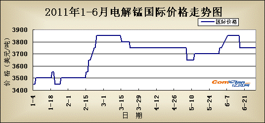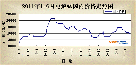 国内市场:总体来看今年上半年电解锰始终整体价格保持较稳运行,波动幅度比前年较少,今年最大幅度为1700元/吨左右。