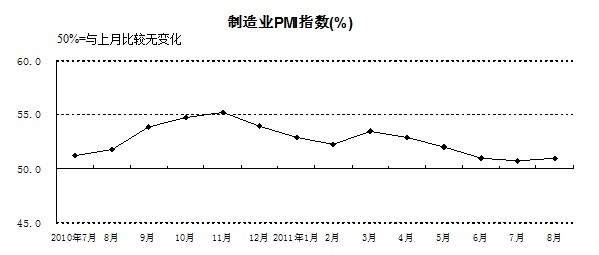 2011年8月,中国制造业采购经理指数(PMI)为50.9%,比上月微升0.2个百分点。该指数为2009年3月以来的次低点,但仍继续位于临界点——50%以上的扩张区间,并结束了连续四个月回落的走势,表明中国制造业经济总体仍处于增长态势。