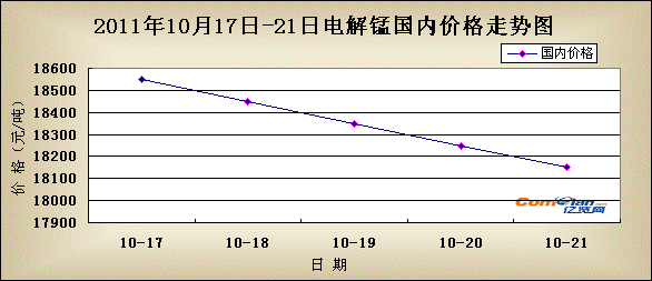 本周电解锰市场持续下跌,由上周18500元/吨左右跌至18100元/吨左右,跌幅打400元/吨,下游企业询盘较多,成交量不大,观望为主。