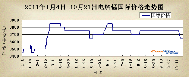 受欧洲债务问题和全球经济状况打压,欧美需求不佳,而且中国国内电解锰价格持续下滑,欧洲电解锰片价格近期走跌,目前中国电解锰FOB出口价格在3650-3700美元/吨。