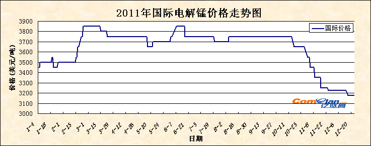 国内市场:据可靠消息,广西地区将从2012年1月1日起将开始执行全年统一电价,电价下调7分左右,电解锰成本将有所下滑,下降幅度约在550元/吨左右,但年底厂家急需回笼资金,出货意愿较强,而电价下调,对市场不但没有起到推动作用,反而令市场更加举步维艰,目前已有部分厂家低价抛货。据湖南、贵州地区部分电解锰厂表示,电解锰行情持续低迷,厂家有意向月底停产,提前放假,预计年初电解锰的开工率仍会呈现下滑趋势。