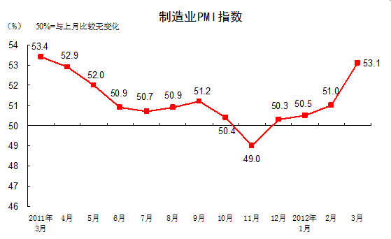 中国经济网北京2012年4月1日讯 据国家统计局网站消息,2012年3月,中国制造业采购经理指数(PMI)为53.1%,比上月提升2.1个百分点,继续位于临界点以上。从3月份中国制造业总体情况看,市场需求明显回升,生产增速加快,企业采购活动趋于活跃,尤其是与装备制造业相关的行业表现尤为突出,表明制造业经济总体保持增长态势。