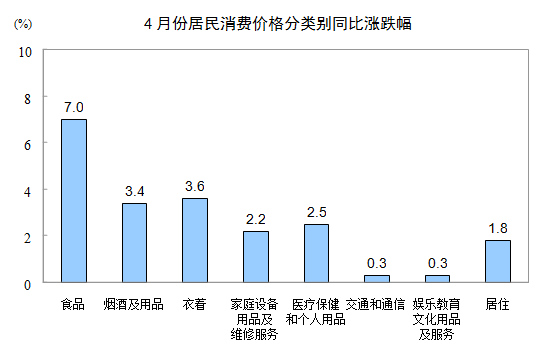 4月份,食品价格同比上涨7.0%,影响居民消费价格总水平同比上涨约2.20个百分点。其中,肉禽及其制品价格上涨8.2%,影响居民消费价格总水平上涨约0.57个百分点(猪肉价格上涨5.2%,影响居民消费价格总水平上涨约0.16个百分点);鲜菜价格上涨27.8%,影响居民消费价格总水平上涨约0.77个百分点;水产品价格上涨11.5%,影响居民消费价格总水平上涨约0.28个百分点;粮食价格上涨3.7%,影响居民消费价格总水平上涨约0.11个百分点;油脂价格上涨5.5%,影响居民消费价格总水平上涨约0.07个百分点;鲜果价格下降9.7%,影响居民消费价格总水平下降约0.23个百分点;蛋价格下降5.9%,影响居民消费价格总水平下降约0.05个百分点。