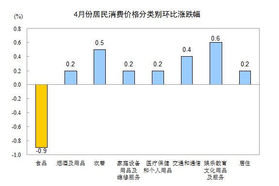 4月份,全国居民消费价格总水平环比下降0.1%。其中,城市持平(涨跌幅度为0),农村下降0.2%;食品价格下降0.9%,非食品价格上涨0.3%;消费品价格下降0.3%,服务项目价格上涨0.5%。