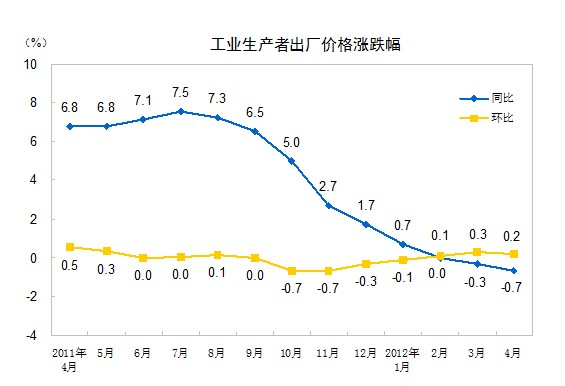 2012年4月份,全国工业生产者出厂价格同比下降0.7%,环比上涨0.2%。工业生产者购进价格同比下降0.8%,环比持平(涨跌幅度为0)。2012年1—4月份平均,工业生产者出厂价格同比下降0.1%,工业生产者购进价格同比上涨0.6%。