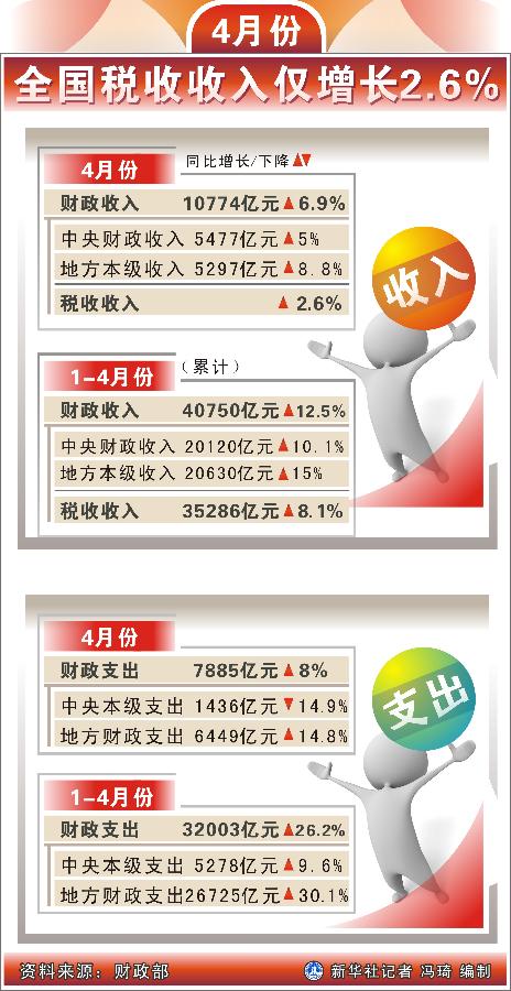 财政部上周五公布的4月份公共财政数据显示,4月份,全国财政收入10774亿元,比去年同月增加692亿元,增长6.9%,财政收入中的税收收入为9428亿元,同比增长2.6%。