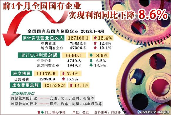 今年前4个月,全国国有及国有控股企业实现利润同比下降8.6%,为连续三个月同比下降,但幅度收窄。