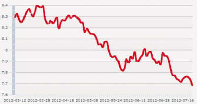 随着地区援助潮的到来,西班牙债券收益率可能会急剧上升至失控状态,届时西班牙将不得不从“银行业”救助升级为寻求全面救助。7月20日瓦伦西亚宣布资金短缺寻求援助后,西班牙主权债券收益率一路飙升。而政府发布的新一轮GDP预测指出,2014年之前,西班牙经济都不会实现增长,又将收益率进一步推高。当日西班牙10年期债券收益率飙升到7.25%,创欧元时代以来新高。人们普遍认为,西班牙无法承受如此之高的收益率,西班牙在向欧盟和国际货币基金组织寻求紧急援助之路上又前进了一步。