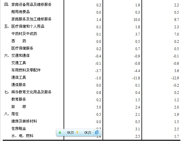 居住价格同比上涨2.1%。其中,住房租金价格上涨3.1%,水、电、燃料价格上涨2.5%,建房及装修材料价格上涨0.5%。