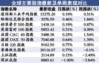 虽然A股近期走势低迷,连连下坠,但受到德国总理默克尔力挺欧元的言论以及趋向乐观的经济数据和经济预期影响,包括亚太股市在内的全球主要股指上周整体走高,其中,欧股创下13个月来新高,西班牙继续领涨。美国道琼斯指数也实现连续六周的上涨。