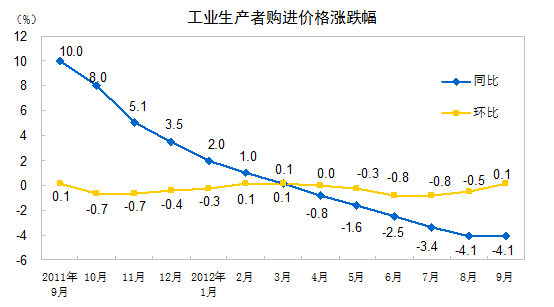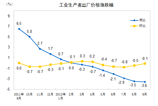 2012年9月份,全国工业生产者出厂价格同比下降3.6%,环比下降0.1%。工业生产者购进价格同比下降4.1%,环比上涨0.1%。1—9月平均,工业生产者出厂价格同比下降1.5%,工业生产者购进价格同比下降1.5%。