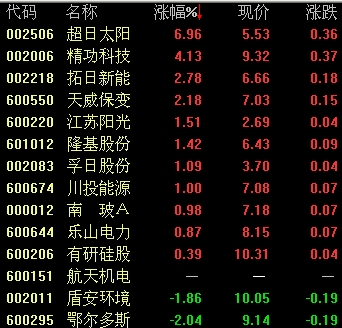 多晶硅板块盘中崛起,个股近全线飘红,其中超日太阳盘中大涨逾7%。截至10:02,超日太阳涨6.96%,精功科技涨逾4%,拓日新能、天威保变均涨逾2%,江苏阳光、隆基股份、南玻A、孚日股份涨逾1%。