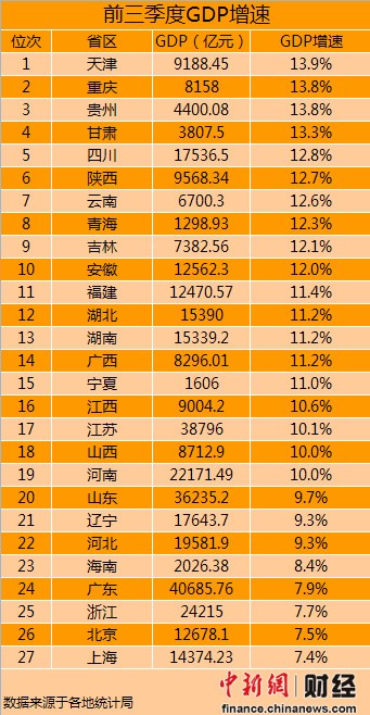根据各地公布的数据,中新网财经频道统计发现,在已经公布的这27个省份中,天津以13.9%的增速居首,重庆(13.8%)和贵州(13.8%)并列第二,而上海增速垫底,仅为7.4%。