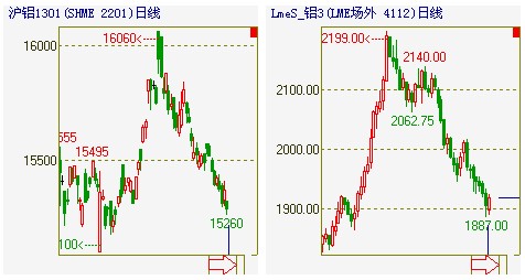 图1:沪铝主力1212合约日K线图 图2:LMES期铝三月合约日K线图
