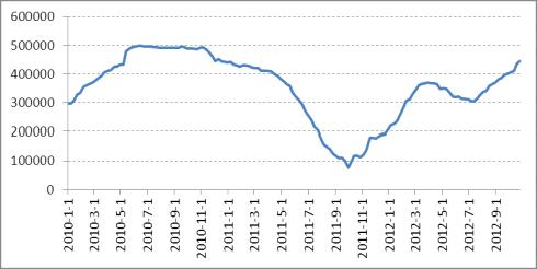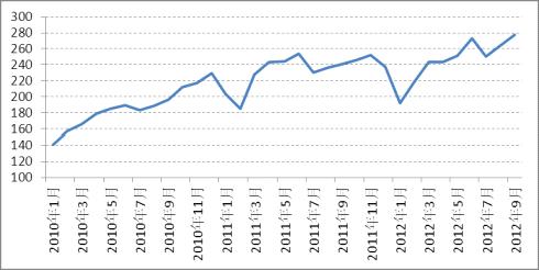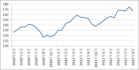 而国内经济增长继续处于下行趋势,三季度GDP增长7.4%,连续7个季度同比增速下滑。9月份CPI达到10.9%,但PPI同比下跌3.6%,显示了国内经济形势并不乐观,唯一有所好转的是投资出口这块相比前期有所改善。经济整体增速放缓,国内较多工业品在需求不振的情况下库存不断增加,在9、10月份的销售旺季没有起色之后,市场更多的关注十八大之后政策面是否能有明显的措施提振国内需求,否则国内经济下滑趋势令人担忧。