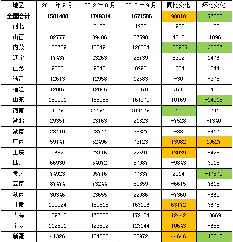 表1列举了2011年9月份、2012年8月和9月份国内电解铝的月度产量数据。和去年9月份的绝对数量比较可以发现,今年整体电解铝产量增加了90018吨,而环比8月份减少77808吨。