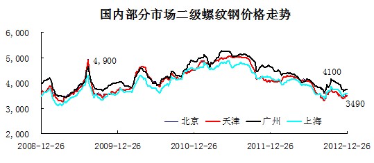 图表一、国内部分市场二级螺纹钢价格走势图(单位:元/吨)
