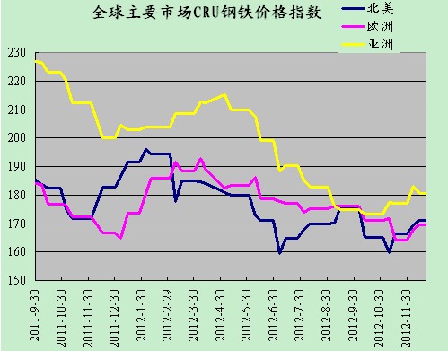 金融经济危机不仅使世界经济陷入疲软,国际贸易回落,而且也影响钢铁需求和价格走势。据世界钢协统计,2012年11月份全球(62个国家)粗钢产量达1.22亿吨,同比增长5.1%。2012年11月份,中国粗钢产量为5750万吨,同比增长13.7%;日本粗钢产量为850万吨,同比下降2.3%;韩国粗钢产量为560万吨,同比下跌2.7%。这从一个侧面验证了世界经济的严峻性,同时也验证了国际钢材和铁矿石的需求疲软。