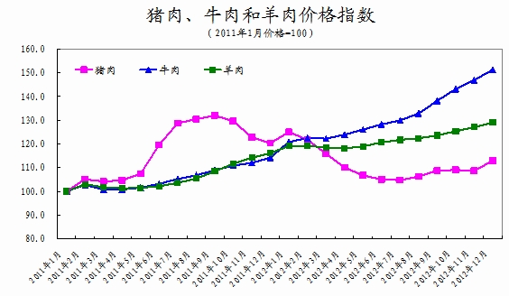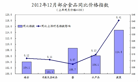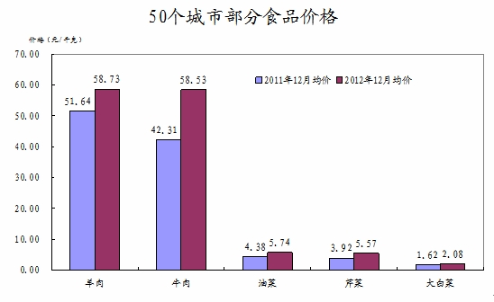 12月份,全国蔬菜价格同比上涨14.8%,上涨最高的地区涨幅达到40.8%。从50个城市主要食品价格旬报监测数据看,部分蔬菜价格同比上涨幅度较大。2012年12月,芹菜、油菜和大白菜价格分别比2011年12月上涨42.1%、31.1%和28.4%。牛、羊肉价格近年来保持持续上涨态势,12月同比分别上涨32.4%和11.1%。猪肉价格虽然仍低于上年同月,但降幅在缩小,比11月份缩小5.3个百分点。