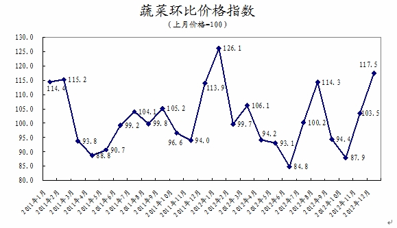 从环比看,12月份非食品价格走势总体较为稳定,食品价格普遍上涨,菜价上涨尤为突出。据了解,2012年是近七年来12月气温最低的一年,部分地方气温突破历史极值,北方降雪偏多,南方多阴雨寡照天气,影响了蔬菜的生产、运输和经营。12月份全国蔬菜价格环比上涨17.5%,影响居民消费价格总水平环比上涨约0.46个百分点,约占CPI环比总涨幅的57.5%,也就是说,在0.8%的CPI环比总涨幅中,近60%来自菜价上涨的影响。