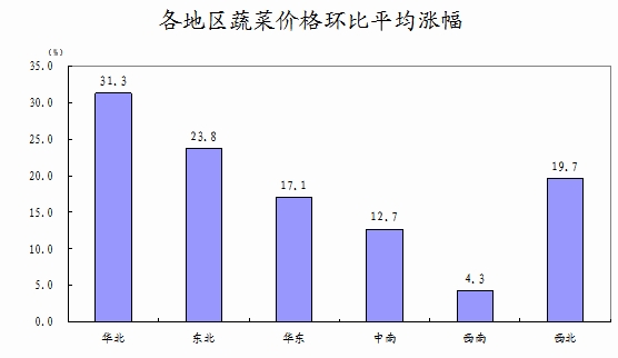 据调查,12月份华北地区菜价上涨最多,平均涨幅达31.3%,个别省份接近40%,有的市县甚至接近70%。