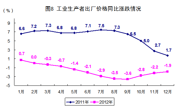 全年居民消费价格比上年上涨2.6%,涨幅比上年回落2.8个百分点。其中,城市上涨2.7%,农村上涨2.5%。分类别看,食品价格比上年上涨4.8%,烟酒及用品上涨2.9%,衣着上涨3.1%,家庭设备用品及维修服务上涨1.9%,医疗保健和个人用品上涨2.0%,交通和通信下降0.1%,娱乐教育文化用品及服务上涨0.5%,居住上涨2.1%。在食品价格中,粮食价格上涨4.0%,油脂价格上涨5.1%,肉禽及其制品价格上涨2.1%,鲜菜价格上涨15.9%,鲜果价格下降1.2%。12月份,居民消费价格同比上涨2.5%,环比上涨0.8%。全年工业生产者出厂价格比上年下降1.7%;12月份同比下降1.9%,环比下降0.1%。全年工业生产者购进价格比上年下降1.8%;12月份同比下降2.4%,环比下降0.1%。