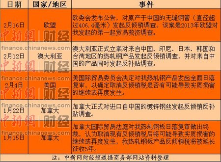 中新网财经频道发现,进入2013年不足2月的时间里,欧盟、美国、澳大利亚等国对中国钢材产品发起5起反倾销调查或终裁。反倾销调查频现,钢铁行业外贸渠道或被进一步压缩,将面临更为严峻地挑战。